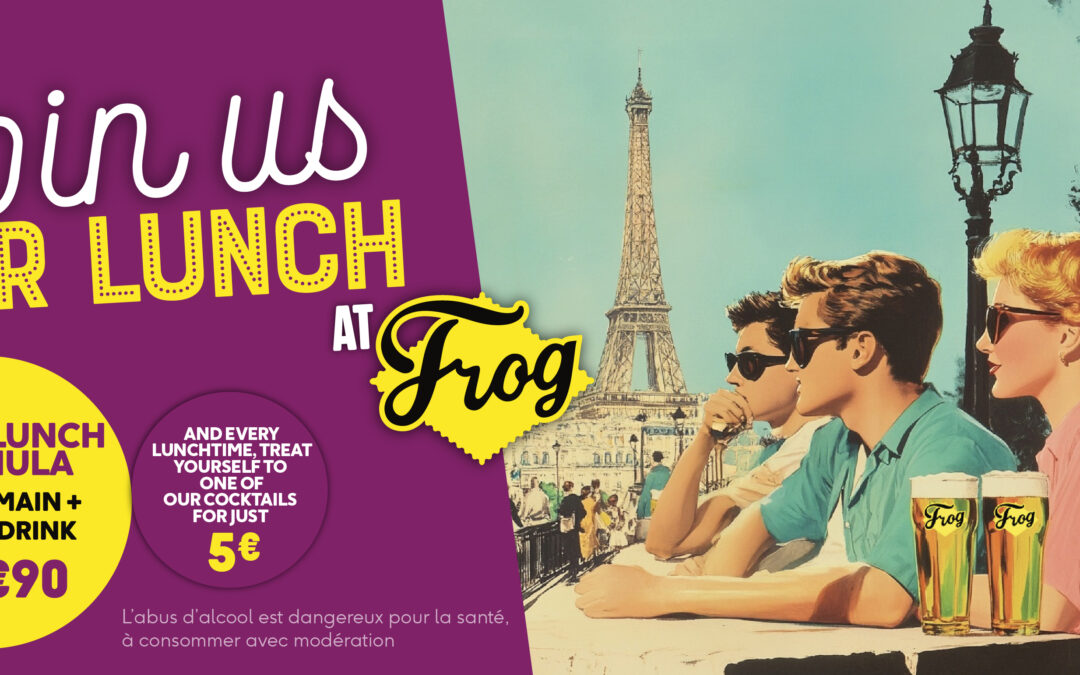Join us for our Quick Lunch Formula – a main course and house drink for just 16€90. Why not make it even better with one of our cocktails for only 5€? Available Monday to Friday at selected Frog Pubs. Not available at Frog & Princess. Book your table now. Terms & conditions apply. Available at lunch only.